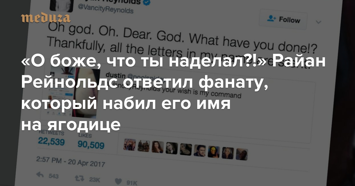 «О боже, что ты наделал?!» Райан Рейнольдс ответил фанату, который набил его имя на ягодице