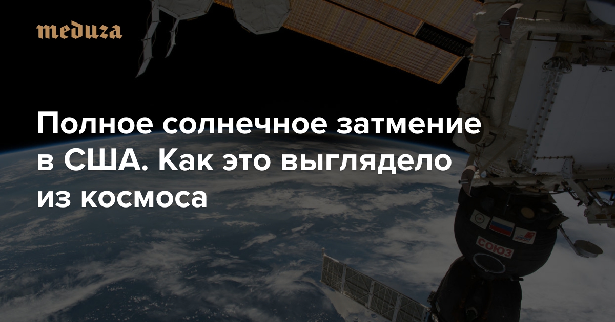 Над США 21 августа прошло полное солнечное затмение. За этим явлением следили не только с Земли, но и из космоса: затмение снимали с МКС и со спутников, наблюдающих за Западным полушарием. «Медуза» показывает, как лунная тень проходила по планете.