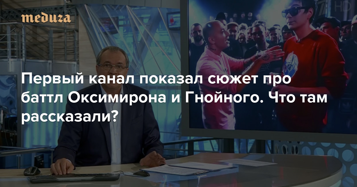 На Первом канале в передаче «Воскресное время» 3 сентября вышел девятиминутный сюжет про рэп-баттл Оксимирона и Гнойного. Встреча двух рэперов состоялась еще 6 августа. Это был первый выпуск «Воскресного времени» после летнего перерыва, поэтому сюжет про Оксимирона и Гнойного вышел спустя месяц после баттла. «Медуза» рассказывает, что узнали зрители Первого канала о баттле (и рэпе в принципе).