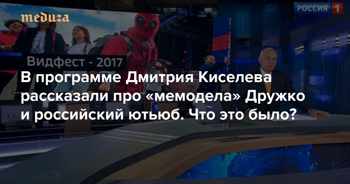 В передаче «Вести недели» на канале «Россия 1» 10 сентября вышел сюжет про видеоблогеров и фестиваль «Видфест». Ведущий Дмитрий Киселев сообщил, что современные подростки сформировали альтернативную культуру, построенную вокруг блогеров, и проводят время не так, как их родители (!!!). «Медуза» пересказывает сюжет, который должен был объяснить зрителям, что такое российский ютьюб и мемы.