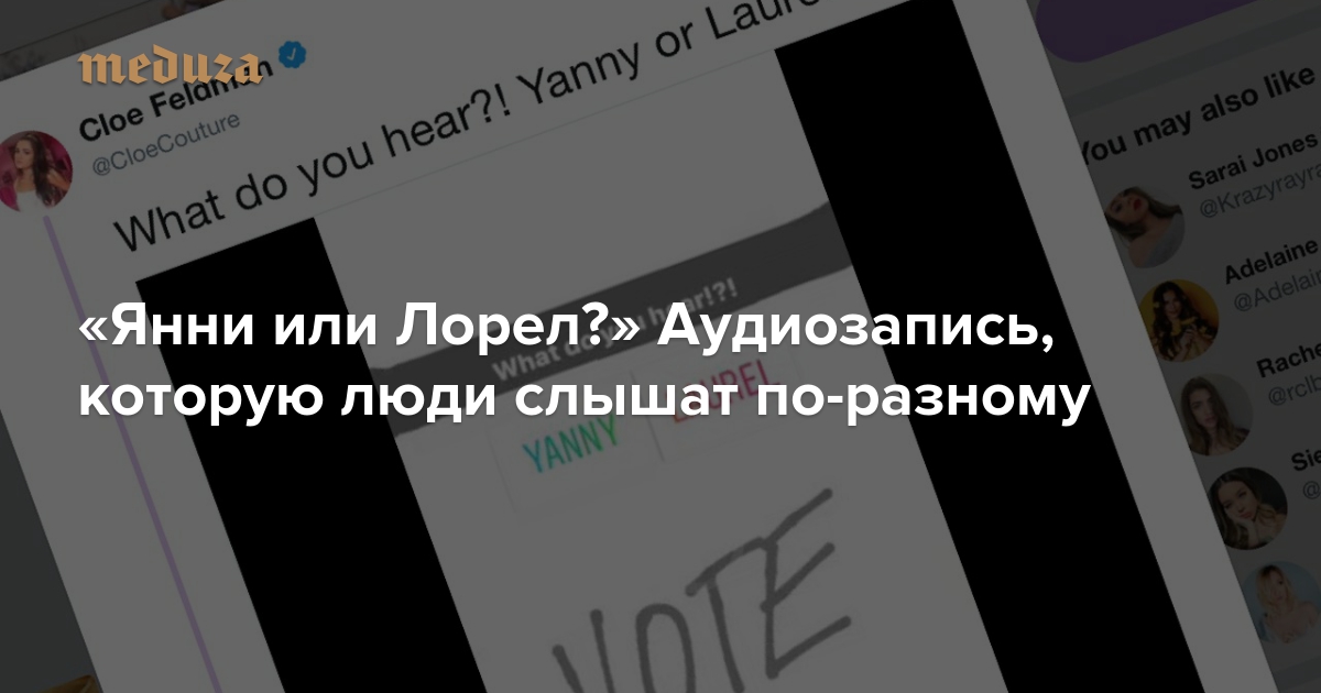 Пользователи Reddit нашли короткий аудиофайл, в котором мужчина произносит имя — некоторые пользователи слышат его как Янни, а другие — Лорел. Многие отмечают, что через некоторое время начинают слышать и второе имя.
