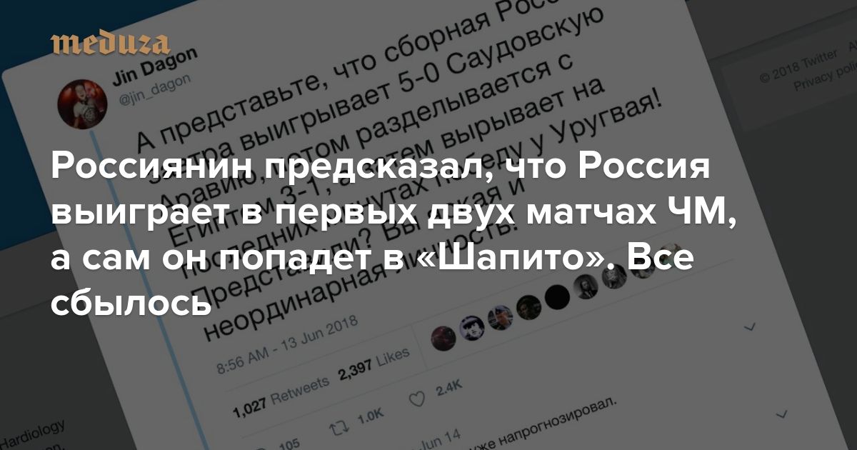 Россиянин предсказал, что Россия выиграет в первых двух матчах ЧМ, а сам он попадет в «Шапито». Все сбылось