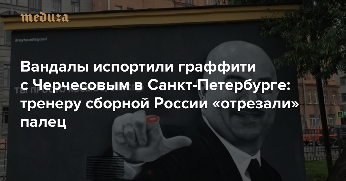 Обновлено: очевидцы рассказали «Фонтанке», что граффити закрасили в ночь на 8 июля фанаты «Зенита». По их словам, фанатов не устраивало, что большой и указательный пальцы тренера формировали L — первую букву названия польского футбольного клуба «Легия», который тренировал Черчесов.