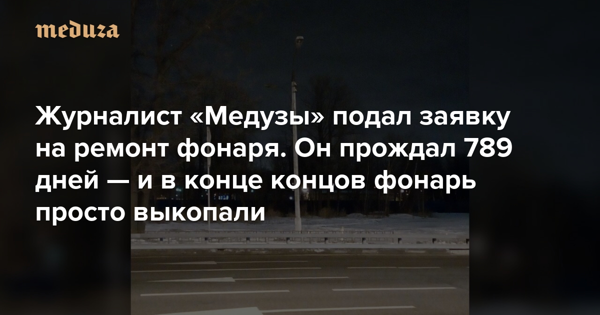 Специальный корреспондент «Медузы» Иван Голунов заметил, что на площади возле аэропорта Внуково перестал работать фонарь. Голунов сообщил о возникшей проблеме в сервис «Наш город»; спустя 21 день ему ответили и пообещали провести ремонтные работы. Голунов начал ждать — и прождал еще 768 дней. В итоге фонарь просто демонтировали.