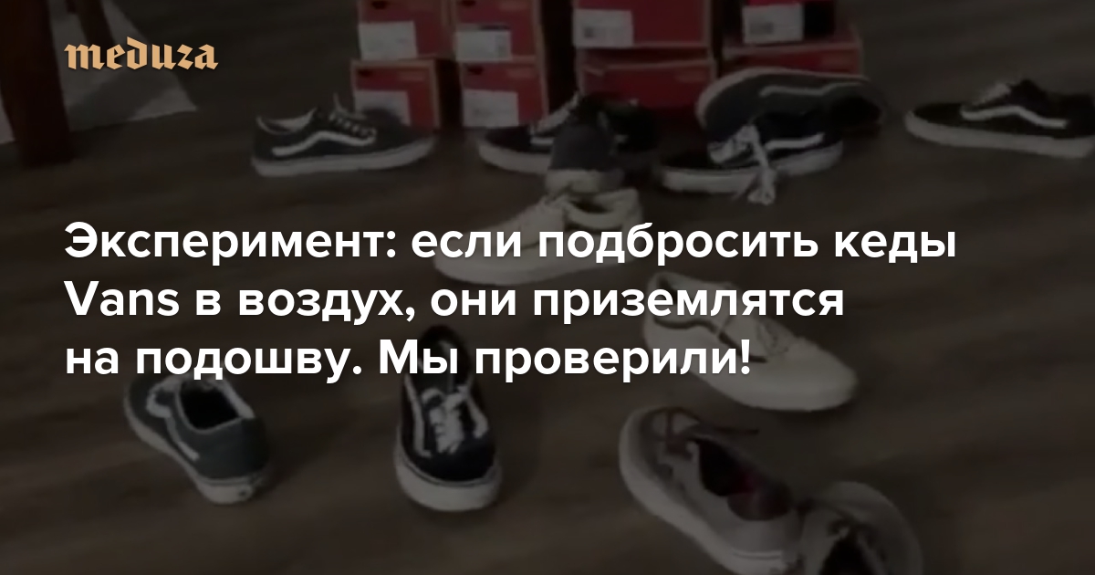 Сотрудники «Медузы» провели свой эксперимент. В четырех из пяти раз кеды Vans успешно приземлялись на подошву. Во время пятой попытки мы подкинули их слишком высоко — в этом случае обувь приземлилась подошвой вверх.