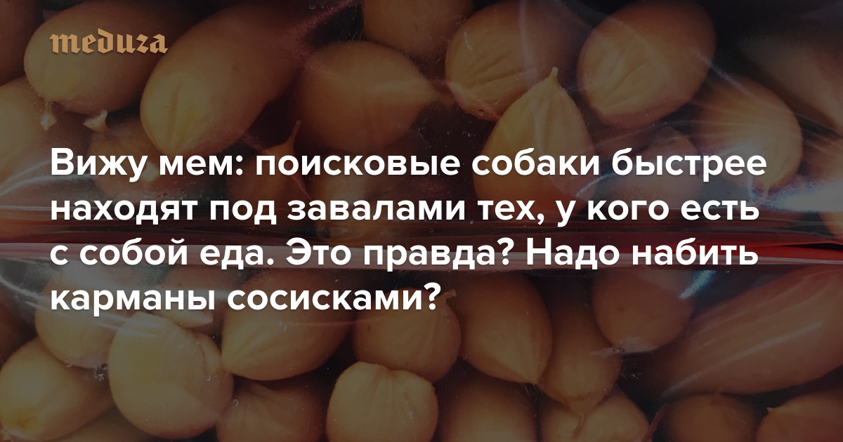 Вижу мем: поисковые собаки быстрее находят под завалами тех, у кого есть с собой еда. Это правда? Надо набить карманы сосисками? 🐕
