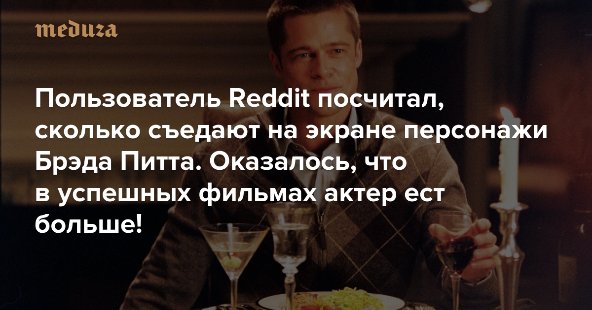 Фильмы с участием Брэда Питта, в которых его персонаж много ест, лучше выступают в прокате и больше ценятся зрителями, чем остальные. Об этом сообщил пользователь Reddit под ником LundgrensFrontKick, который потратил месяц на подтверждение этой закономерности и составил подробный отчет со статистикой.