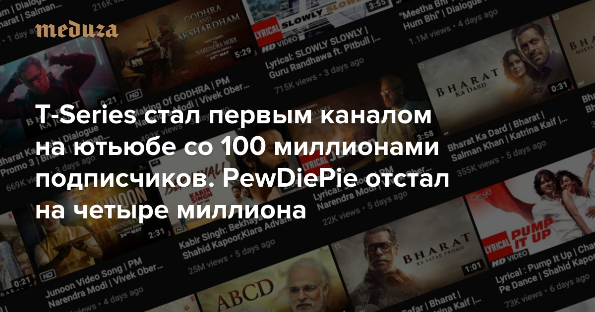 T-Series стал первым каналом на ютьюбе со 100 миллионами подписчиков. PewDiePie отстал на четыре миллиона