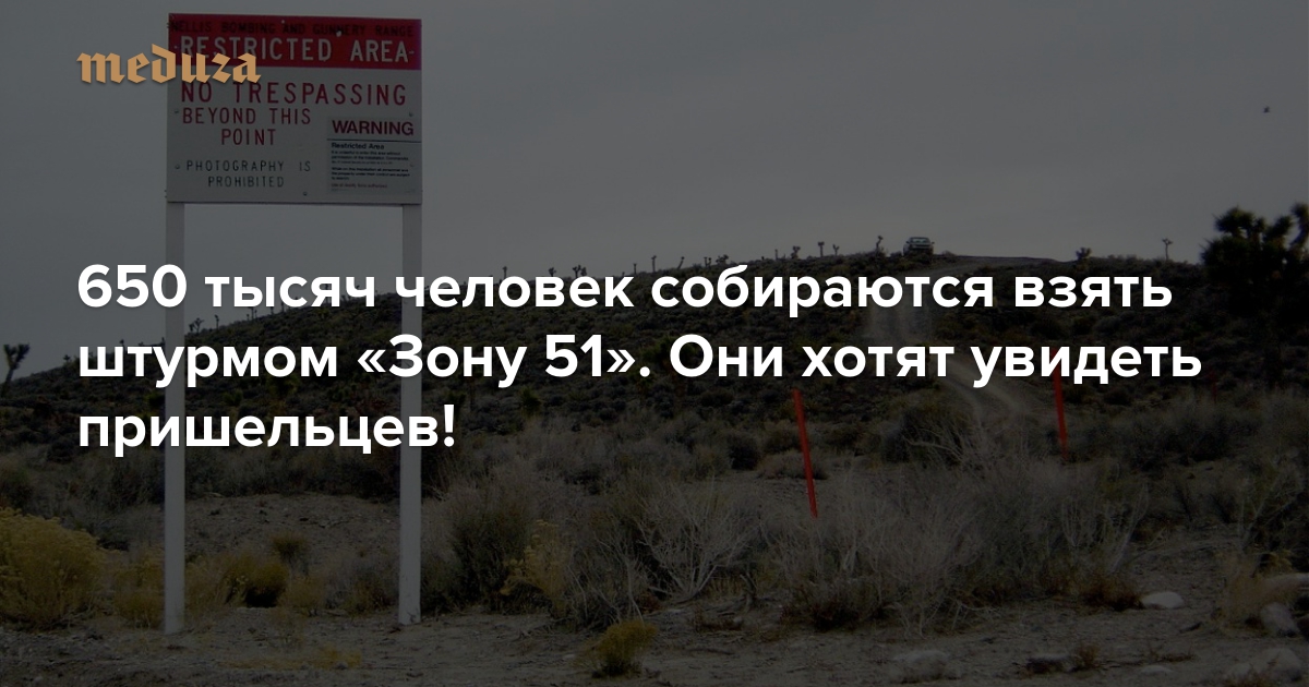 В конце июня в фейсбуке появилось событие «Штурм „Зоны 51“. Они не смогут остановить всех нас». Его создали администраторы мем-сообщества Shitposting cuz im in shambles. На момент публикации «Медузы» больше 650 тысяч пользователей отметили, что собираются поучаствовать в штурме; больше 600 тысяч указали, что интересуются этим событием.