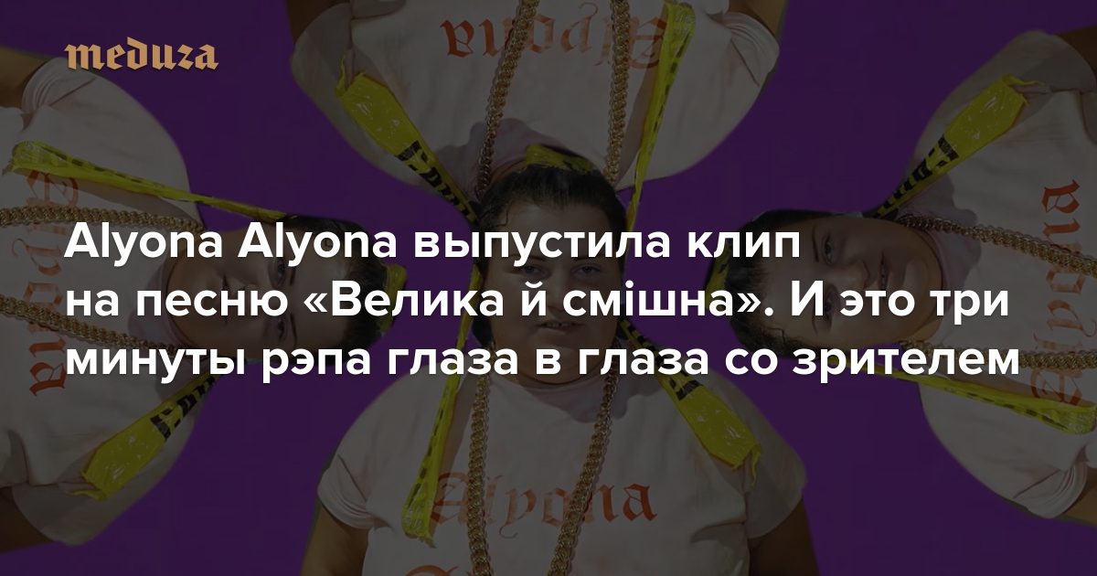 Главная звезда украинского рэпа Alyona Alyona (это она написала скорострельный хит «Рибки 2») экранизировала песню «Велика й смішна» со своего дебютного альбома «Пушка». В клипе исполнительница бойко читает рэп на фоне баскетбольных площадок, гимнастических залов и украинских дворов. В видеоряд то и дело вплетается нечто психоделическое — вроде нарисованных взрывов и трехмерных младенцев.