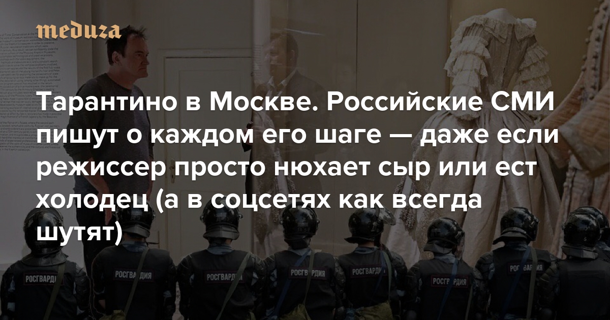 Тарантино в Москве. Российские СМИ пишут о каждом его шаге — даже если режиссер просто нюхает сыр или ест холодец (а в соцсетях как всегда шутят)