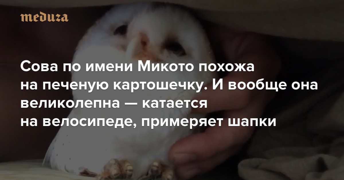 Сова по имени Микото похожа на печеную картошечку. 🦉 И вообще она великолепна — катается на велосипеде, примеряет шапки