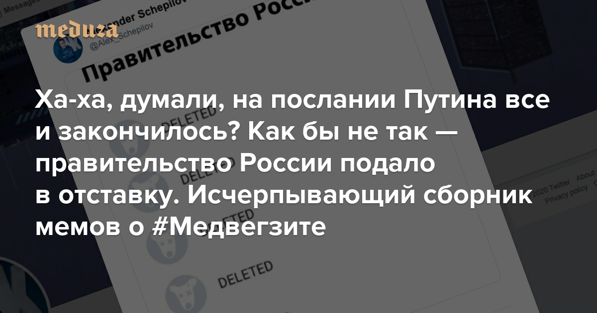 Ха-ха, думали, на послании Путина все и закончилось? Как бы не так — правительство России подало в отставку. Исчерпывающий сборник мемов о #Медвегзите