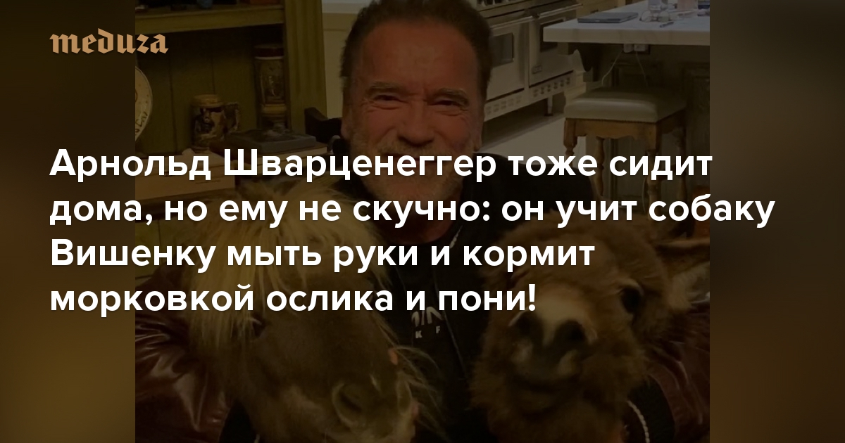 Арнольд Шварценеггер тоже сидит дома, но ему не скучно: он учит собаку Вишенку мыть руки и кормит морковкой ослика и пони!