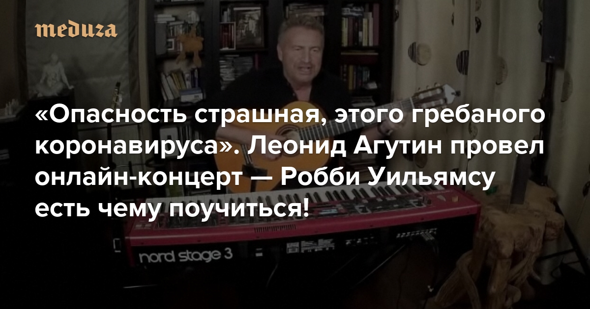 Самоизолировавшийся на даче Леонид Агутин в инстаграме и эфире «Дождя» провел «концерт в тапочках». Выступление певец начал так: «Ну, ребята, все плохо, все очень плохо! Опасность страшная, этого гребаного коронавируса… Одно хорошее есть, что в связи с ним возникла такая идея с вами пообщаться вот таким вот образом». После чего Агутин в течение часа играл на синтезаторе и гитаре, а также пел свои песни.