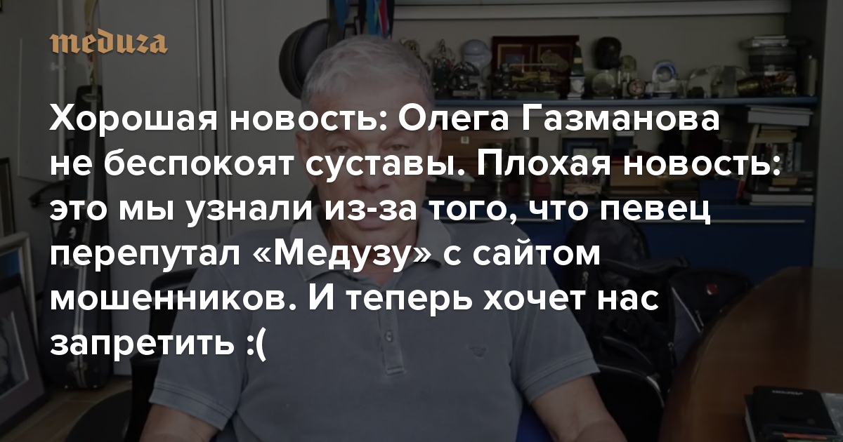 Хорошая новость: Олега Газманова не беспокоят суставы. Плохая новость: это мы узнали из-за того, что певец перепутал «Медузу» с сайтом мошенников И теперь хочет нас запретить 😔