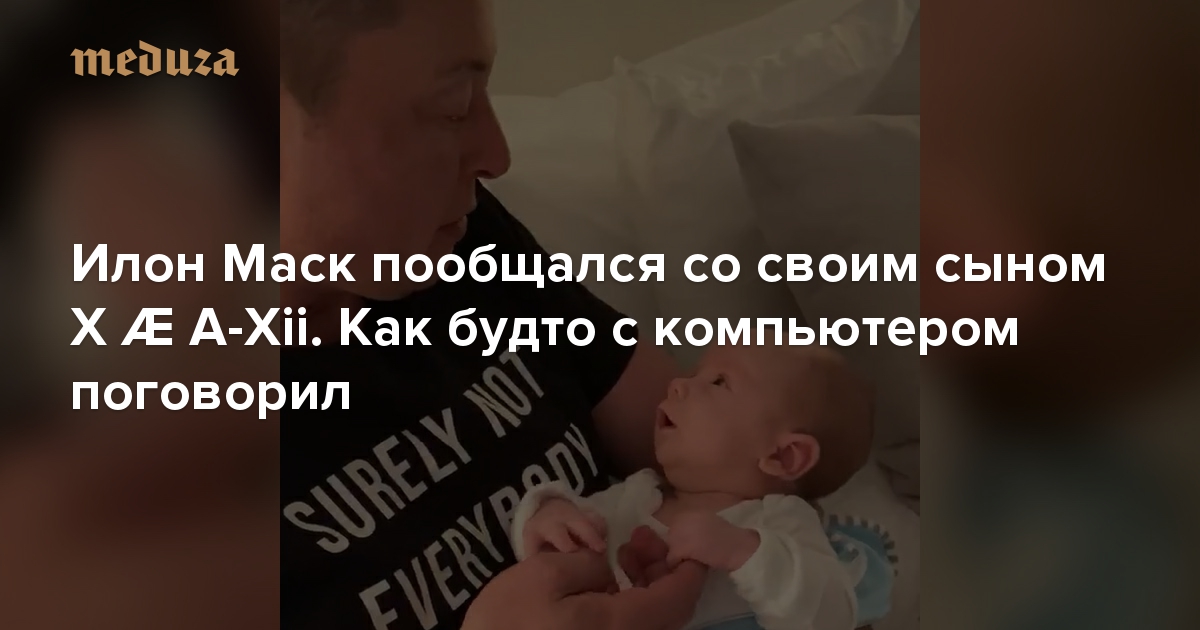 Глава Tesla Илон Маск пообщался со своим сыном X Æ A-Xii (читается как «Экс Эш Эй-Твелв»). Звучал он при этом так, будто обучал искусственный интеллект или выходил на связь с инопланетянином. «Ты слышишь мой голос? Мой голос тебе знаком? Кто я? Говорит твой отец. Здравствуй. Здравствуй, малыш. Малыш X». Видео с участием отца и сына выложила Мэй Маск, мать Илона Маска.