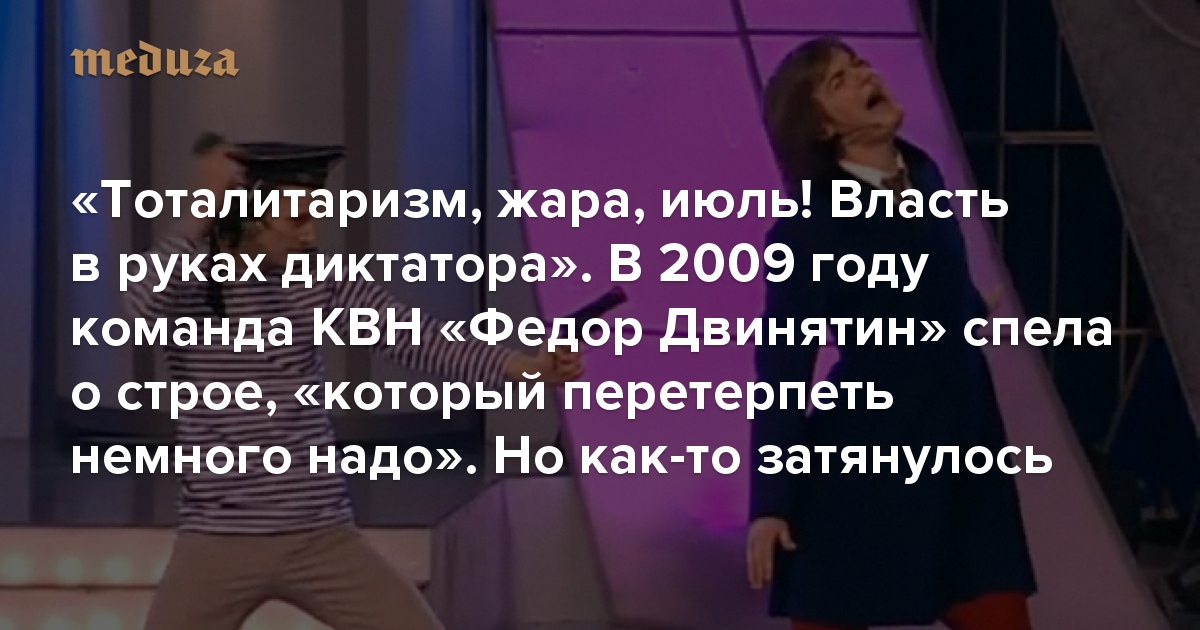 «Тоталитаризм, жара, июль! Власть в руках диктатора» В 2009 году команда КВН «Федор Двинятин» спела о строе, «который перетерпеть немного надо». Но как-то затянулось