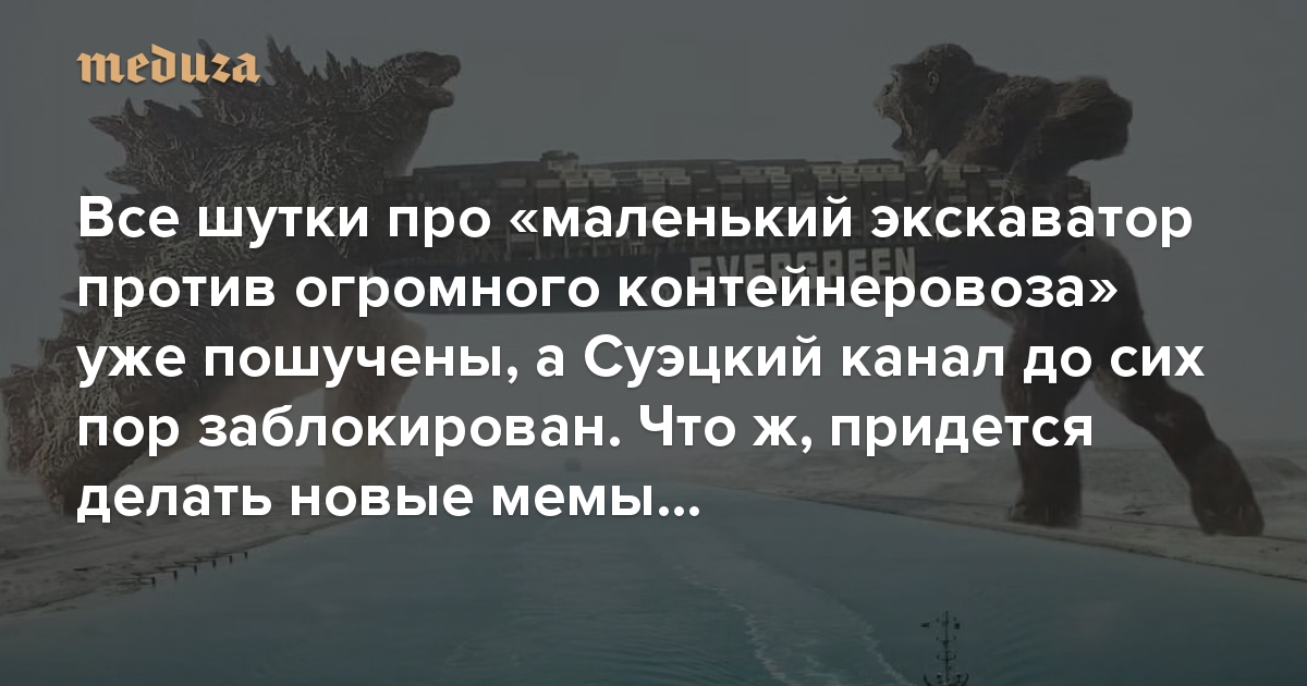 Все шутки про «маленький экскаватор против огромного контейнеровоза» уже пошучены, а Суэцкий канал до сих пор заблокирован Приходится делать новые мемы — с Годзиллой и ракетами SpaceX