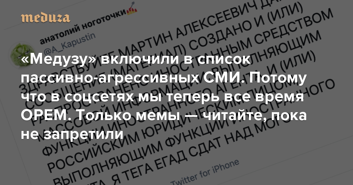 «Медузу» включили в список пассивно-агрессивных СМИ. Потому что в соцсетях мы теперь все время ОРЕМ 😡 Только мемы — читайте, пока не запретили