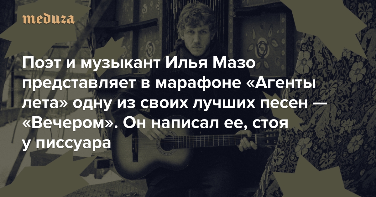 «Я ссал и плакал одновременно» Поэт и музыкант Илья Мазо представляет в марафоне «Агенты лета» одну из своих лучших песен — «Вечером». Он написал ее, стоя у писсуара