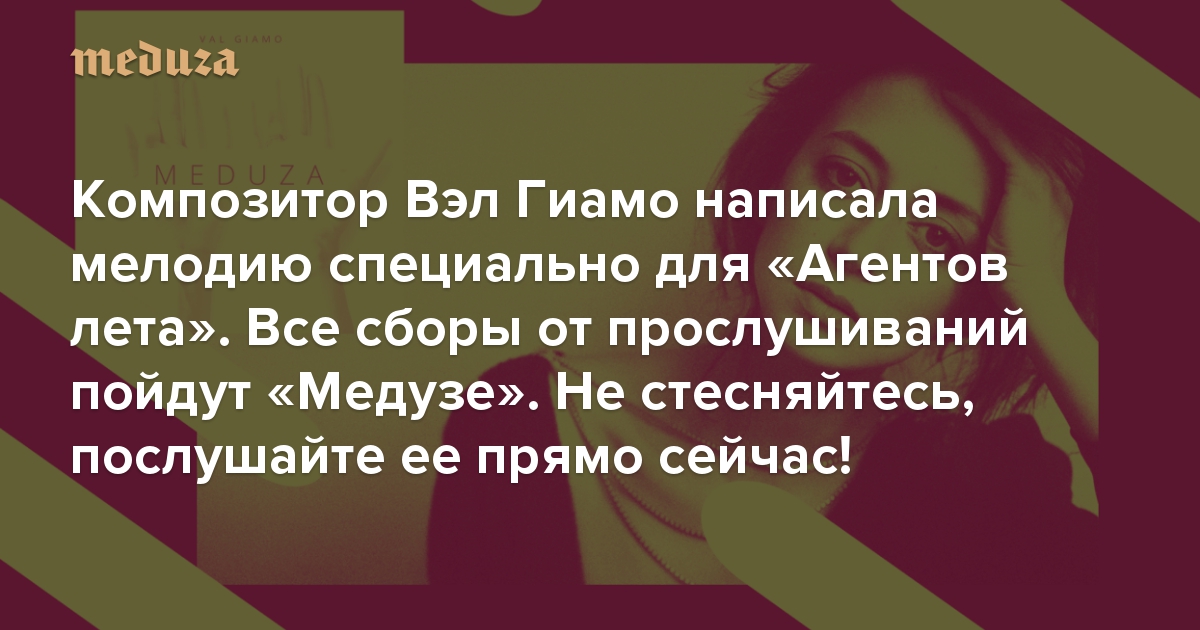 Композитор Вэл Гиамо написала мелодию специально для «Агентов лета» Все сборы от прослушиваний пойдут «Медузе». Не стесняйтесь, послушайте ее прямо сейчас!