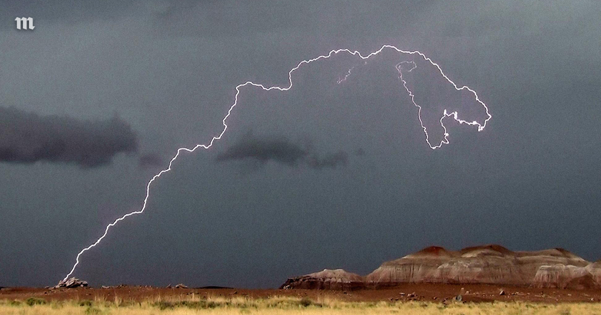 Молнию, которая нарисовала в небе голову тираннозавра, сфотографировали в национальном парке Петрифайд-Форест (штат Аризона).