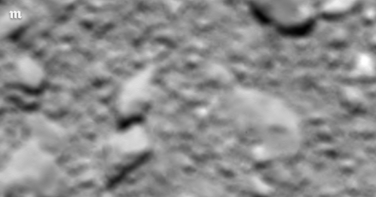 Поверхность кометы Чурюмова-Герасименко, снятая с высоты в 51 метр. Это последняя фотография, которую успел передать космический аппарат «Розетта» перед падением на комету. Расстояние от края до края фотографии — 2,4 метра.