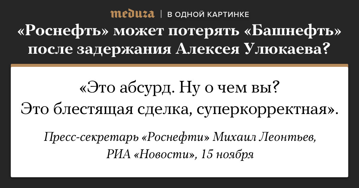 В ночь на 15 ноября в Москве задержали министра экономического развития Алексея Улюкаева. Как заявили в СК, его задержали при получении взятки от «Роснефти» — по версии следователей, Улюкаев вымогал у этой нефтяной компании деньги за то, чтобы Минэкономразвития выступило в поддержку продажи государственного пакета «Башнефти» именно «Роснефти». Главное о задержании Улюкаева — здесь.