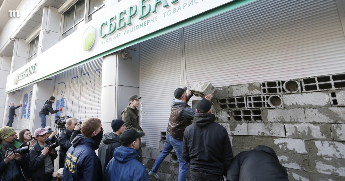 В Киеве активисты, требующие ухода с украинского рынка российских банков, заложили бетонными блоками вход в головной офис «дочки» Сбербанка. Акция была организована «Гражданским корпусом», созданным на базе националистической организации «Азов». По словам активистов, они будут круглосуточно блокировать офис Сбербанка до тех пор, пока Нацбанк Украины не отзовет у него лицензию, а Верховная Рада не примет закон о запрете работы на Украине российских банков. Ранее 13 марта «Азов» опубликовал на своем сайте заявление об акции «неизвестных патриотов», заливших монтажной пеной «десятки банкоматов» российских банков на Украине.