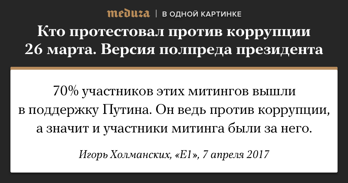 26 марта по всей России прошли акции протеста против коррупции, поводом для которых стало расследование Фонда борьбы с коррупцией Алексея Навального о «тайной империи» Дмитрия Медведева. Игорь Холманских стал известен после того, как во время протестов в Москве в 2011 году предложил приехать «с мужиками» и разобраться с демонстрантами. В 2012 году он стал полпредом президента Владимира Путина в Уральском федеральном округе.