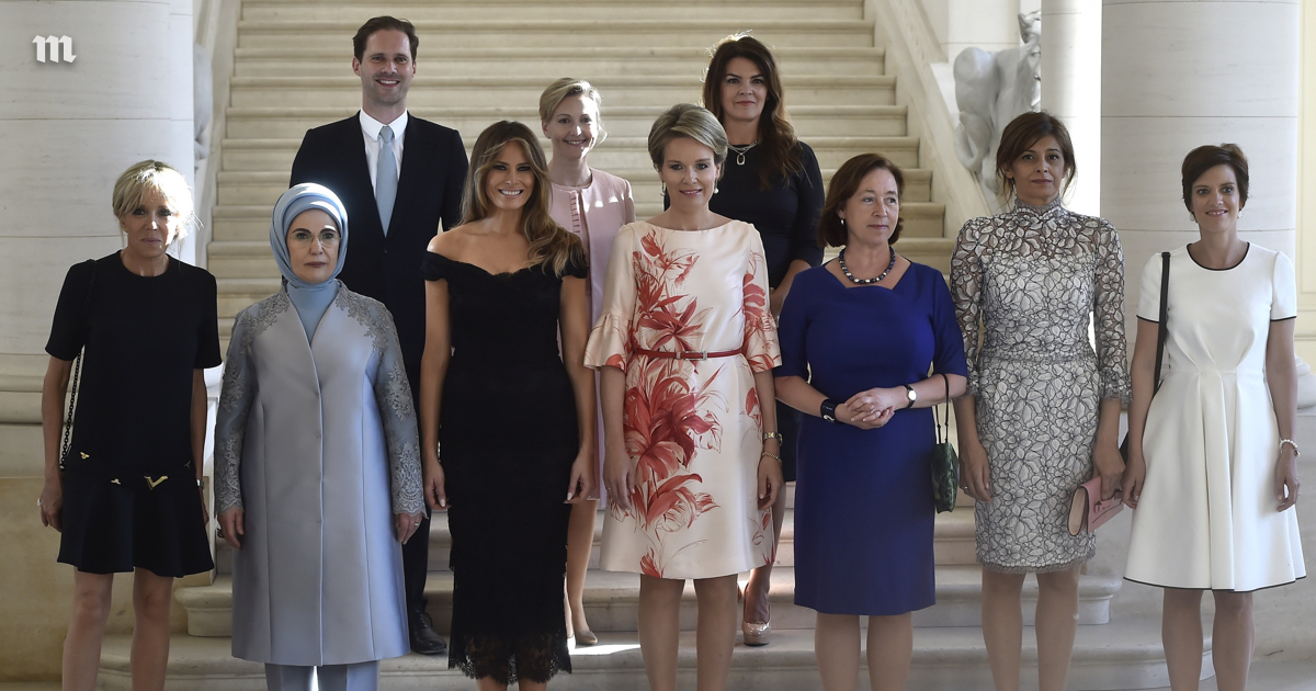 Парадный портрет супругов участников саммита НАТО, прошедшего 25 мая в Брюсселе. Первый ряд (слева направо): жена президента Франции Брижит Макрон, жена президента Турции Эмине Эрдоган, жена президента США Мелания Трамп, королева Бельгии Матильда, жена генсека НАТО Ингрид Шулеруд, жена президента Болгарии Десислава Радева, партнерша премьер-министра Бельгии Амели Дербодрангьен. Второй ряд (слева направо): супруг премьер-министра Люксембурга (и открытого гея) Готье Дестене, партнерша премьер-министра Словении Мойка Стропник, жена премьер-министра Исландии Тора Маргрет Бальдвинсдоттир.
