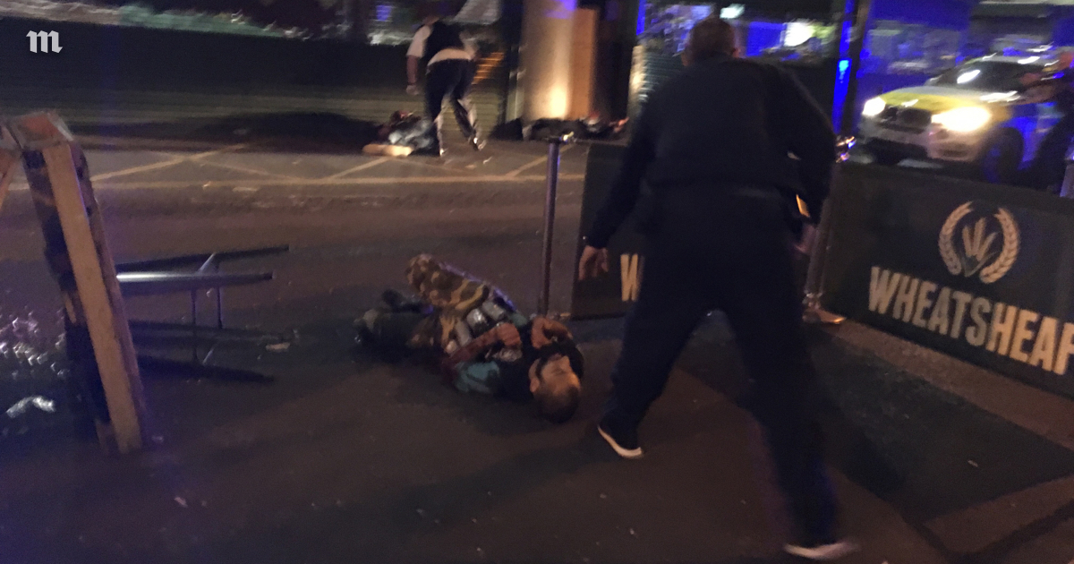 Убитый террорист, участвовавший в нападении на прохожих в Лондоне. На теле преступника закреплен муляж взрывного устройства. Всего в нападении участвовали трое террористов, их застрелили полицейские.