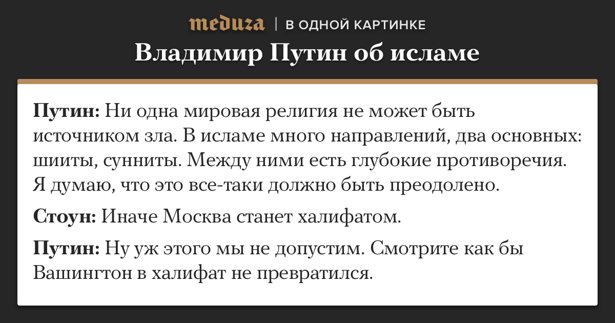 14 июня вышла третья серия сериала «Путин» Оливера Стоуна. В ней Путин рассказывал о конфликтах на Украине и в Сирии, но в его словах не было ничего нового. На наш взгляд, из интересного в ней — только этот диалог про ислам. Про первую и вторую серии мы писали подробнее.