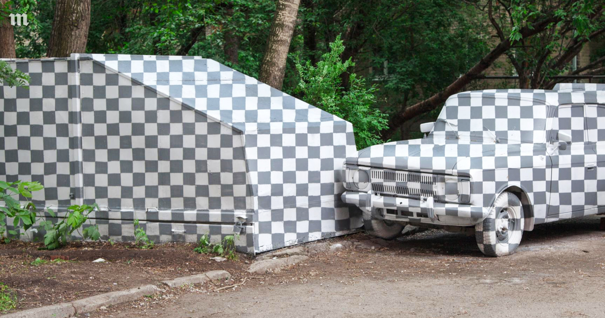 Художники фестиваля «Стенограффия», который проходит в Екатеринбурге, раскрасили старый «Москвич» и гараж-«ракушку», стоящие в одном из дворов города. Таким образом они «вырезали» объекты из реальности — бело-серой клеткой в графическом редакторе Photoshop изображаются прозрачные слои.