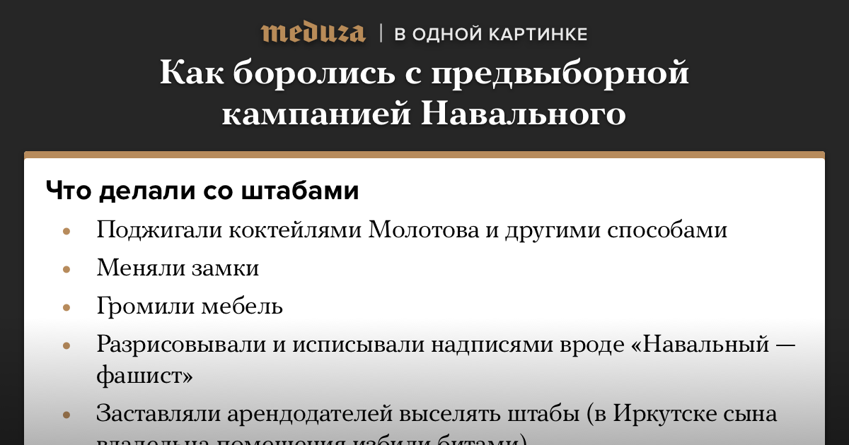 Поджечь, разгромить, изъять, разбить, уволить: основные методы борьбы со штабами Навального
