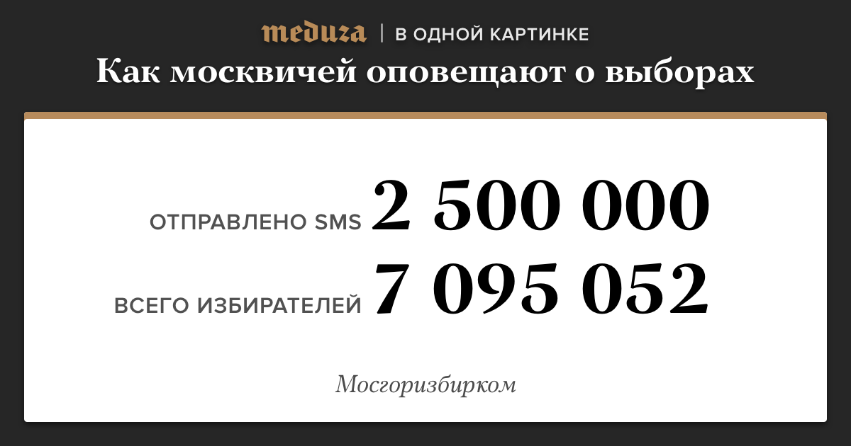 Центризбирком отчитал московские комиссии за то, что они <a href="https://open-mind-network.online/news/2017/09/07/vedomosti-meriya-moskvy-reshila-ne-osveschat-munitsipalnye-vybory-chtoby-provesti-svoih-kandidatov" target="_blank">плохо</a> организовали оповещение о выборах 10 сентября. После этого глава Мосгоризбиркома Валентин Горбунов заявил <a href="http://www.interfax.ru/" target="_blank">«Интерфаксу»</a>, что москвичам отправили более 2,5 миллиона SMS о предстоящем голосовании. Но в 125 <a href="http://www.moscow_city.vybory.izbirkom.ru/region/moscow_city" target="_blank">районах</a>, где проходят выборы, живут, по <a href="http://mosgorizbirkom.ru/4880" target="_blank">данным</a> на 1 июля, более семи миллионов избирателей. Горбунов пояснил, что SMS отправляют тем, кто зарегистрирован на портале госуслуг, но их <a href="http://dgi.mos.ru/presscenter/news/detail/4806542.html" target="_blank">тоже</a> почти шесть миллионов. Кого будут выбирать в Москве, вы можете узнать <a href="https://open-mind-network.online/feature/2017/09/08/skoro-vybory-munitsipalnyh-deputatov-a-ya-voobsche-ne-znayu-chto-eto-pomogite" target="_blank">тут</a>.