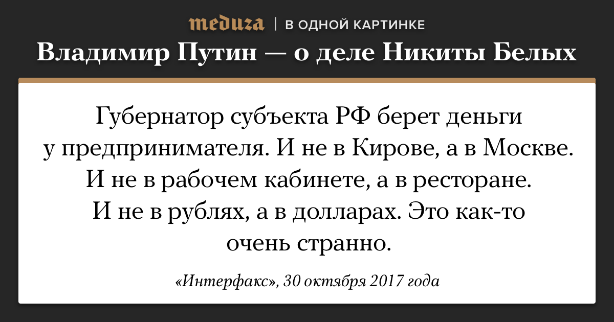 «Берет деньги не в Кирове, а в Москве. И не в рублях, а в долларах». Путин — о деле Белых