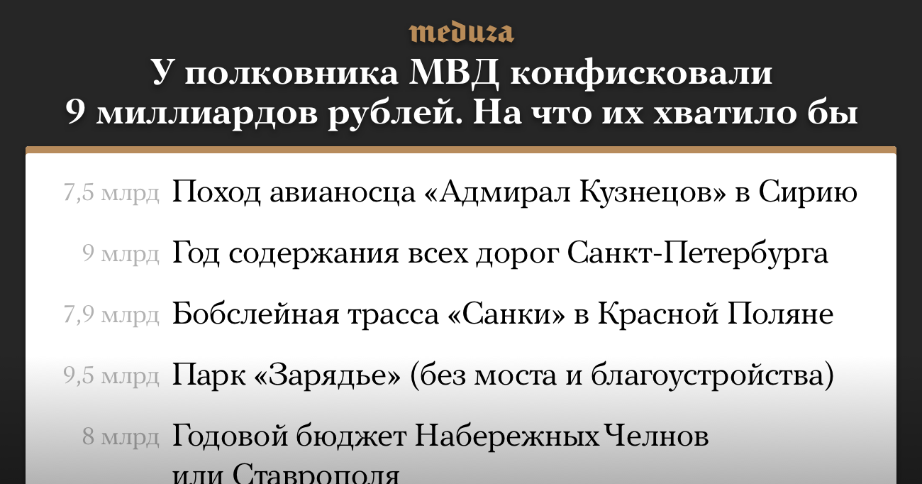 Никулинский суд Москвы постановил, что найденные у бывшего заместителя начальника управления «Т» Главного управления экономической безопасности и противодействия коррупции (ГУЭБиПК) МВД России Дмитрия Захарченко и его родственников деньги и имущество будут конфискованы. В общей сложности бюджет получит около 9 миллиардов рублей. Это сумма, сопоставимая с бюджетами целых городов и крупнейших инфраструктурных проектов.
