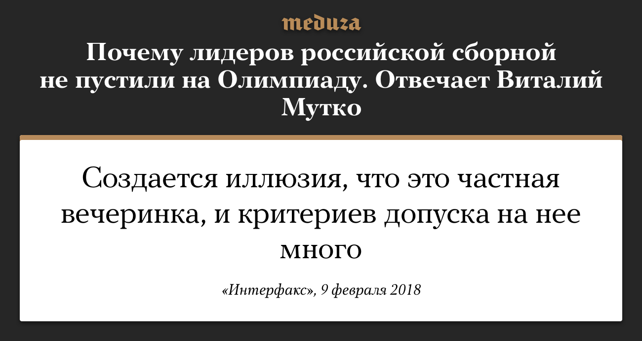 Утром 9 февраля, за несколько часов до начала Олимпийских игр в Пхенчхане, спортивный арбитраж подтвердил, что главные российские звезды (Виктор Ан, Антон Шипулин, Сергей Устюгов и другие) туда не поедут. Суд подтвердил, что, хотя спортсмены не были замешаны в допинговом скандале, у Международного олимпийского комитета есть право не выдавать им приглашения — процедура при этом не была нарушена. Вице-премьер Виталий Мутко заявил, что не удивлен решению суда.