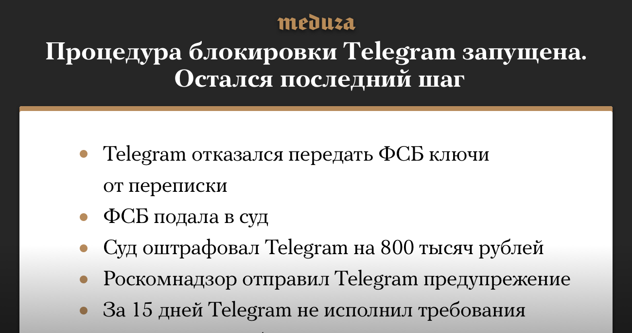 В России запущена процедура блокировки мессенджера Telegram — 20 марта Роскомнадзор официально уведомил сервис о несоблюдении закона. Поводом для этого стал отказ Telegram передавать ФСБ ключи шифрования от переписки пользователей. Теперь, если Telegram не изменит своего решения, РКН сможет обратиться в суд. Сколько займет вся процедура блокировки, неизвестно. Картинка будет обновляться по мере прохождения стадий процесса блокировки.