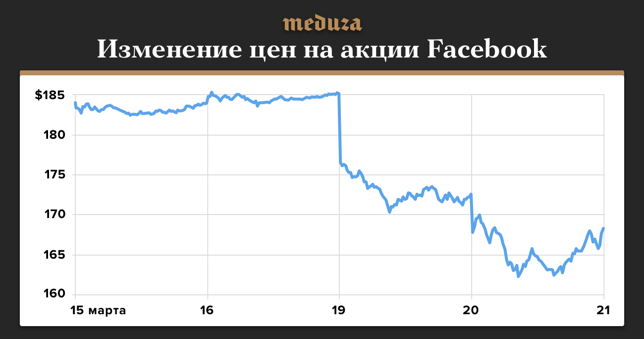 Вечером в пятницу, 16 марта, акции Facebook стоили 189 долларов. В выходные The Guardian и The New York Times опубликовали расследования о деятельности компании Cambridge Analytica, которая собрала данные о 50 миллионах пользователей соцсети без их ведома. Уже к вечеру вторника, 20 марта, акции Facebook стали стоить 167 долларов. Социальная сеть теперь стоит меньше 500 миллиардов долларов. Для сравнения: Berkshire Hathaway стоит 507 миллиардов долларов, Microsoft — 717 миллиардов, Alphabet, он же Google — 761 миллиард, Amazon — 768 миллиардов, Apple — 889 миллиардов.