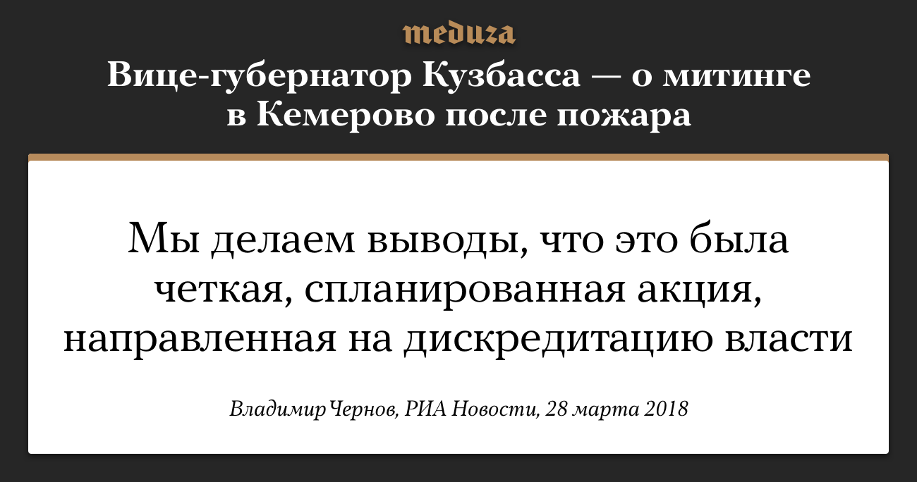 27 марта жители Кемерово собрались на стихийный митинг в центре города, где более десяти часов требовали ответов по поводу количества погибших в пожаре в ТЦ «Зимняя вишня». Периодически участники митинга призывали к отставке руководства региона. На следующий день первый вице-губернатор Кузбасса Владимир Чернов заявил, что на площади была «подогретая молодежь», которая не понимала, что там делает. Как прошел этот митинг, можно прочитать в репортаже «Медузы».