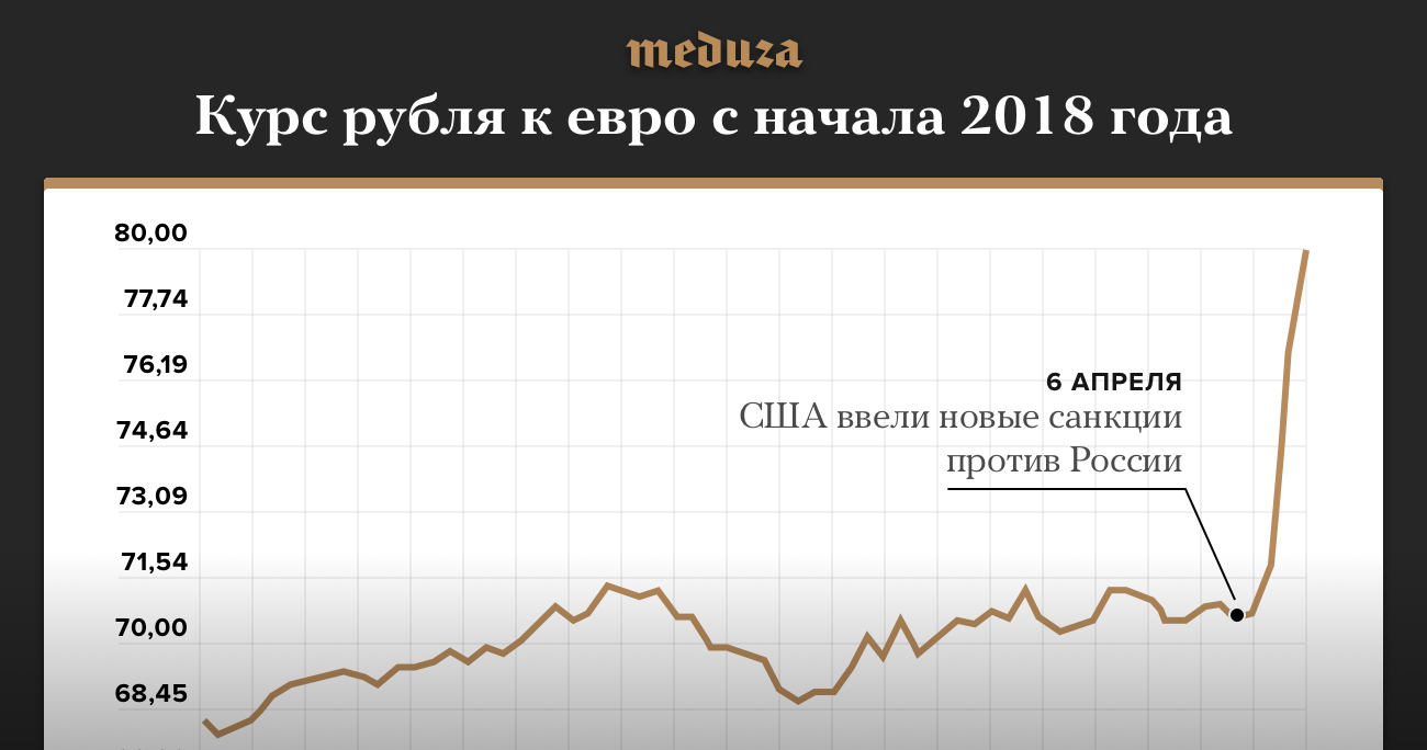 11 апреля курс рубля продолжил падение на Московской бирже. Евро пересек отметку 80 рублей, доллар вплотную приблизился к 65. Российская валюта и акции российских компаний падают в цене третий день после того, как США ввели новые санкции. Помимо этого Вашингтон готовится к обстрелу Сирии в ответ на предполагаемое применение химического оружия в городе Дума. Москва назвала обвинения необоснованными и оставила за собой право вести противоракетную оборону Сирии.