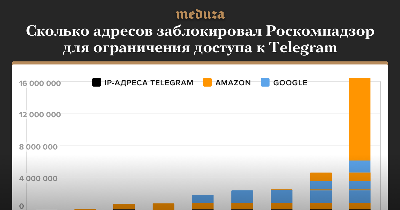 Утром 16 апреля Роскомнадзор начал рассылать провайдерам требования о блокировке Telegram. Сначала ведомство требовало прекратить доступ только к IP-адресам серверов самого мессенджера. Но затем в реестр запрещенных сайтов добавили сотни тысяч адресов облачного сервиса Amazon, который Telegram использовал для обхода блокировок. К ним добавился миллион адресов сервиса Google. Для отслеживания количества заблокированных адресов создан специальный сайт. Подробнее о последствиях масштабной блокировки читайте тут. Эта картинка будет обновляться.