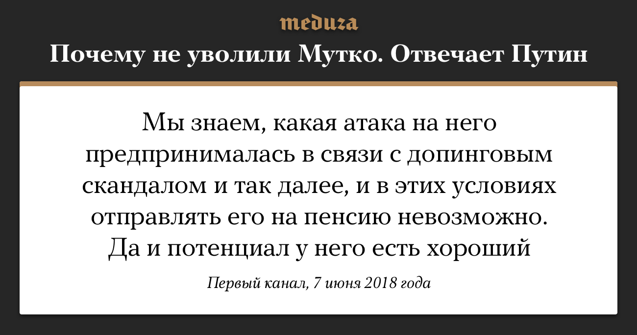 В ходе «прямой линии» президент РФ Владимир Путин ответил на вопрос о «непотопляемости» бывшего министра спорта Виталия Мутко, который в новом российском правительстве занял пост вице-премьера по строительству. Президент рекомендовал обращать внимание не на «эмоциональные», а «фактические» стороны его деятельности. Ранее премьер-министр Дмитрий Медведев также заявлял, что Мутко не отправили на пенсию, чтобы «не прогибаться под внешними обстоятельствами».