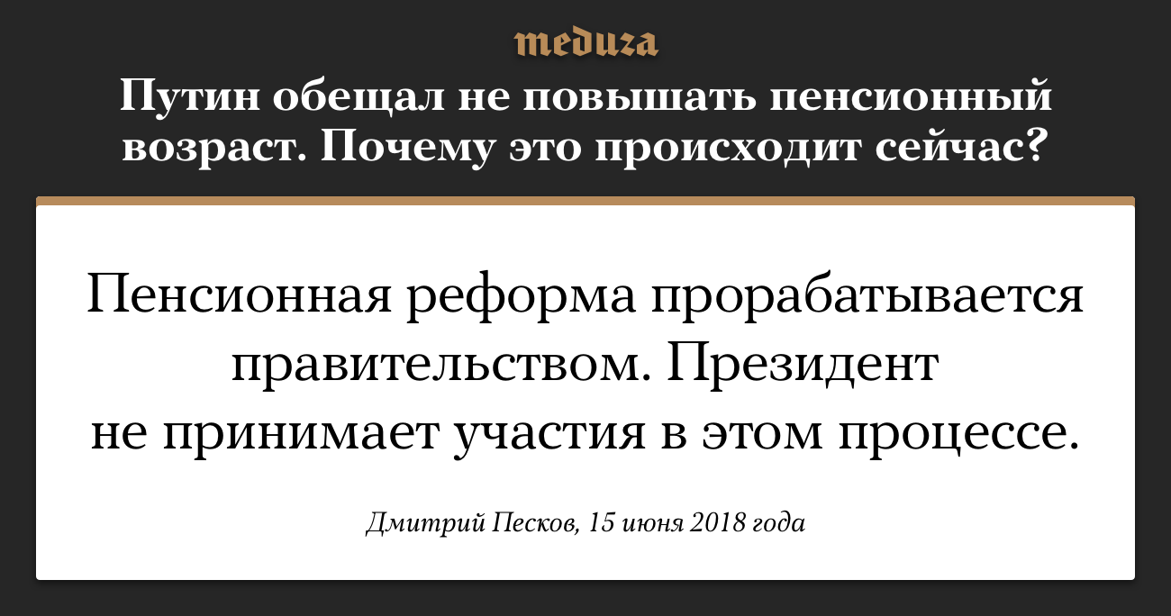 Пресс-секретарь президента РФ Дмитрий Песков прокомментировал журналистам обещание Владимира Путина 2005 года о том, что в России не будет повышаться пенсионный возраст, пока он возглавляет государство. По словам Пескова, тема пенсионной реформы относится к компетенции правительства. Кроме того, заявил он, за последние 13 лет в стране произошли изменения «с точки зрения демографии, уровня развития экономики, международной конъюнктуры и улучшения показателей продолжительности жизни», которые влияют на текущую ситуацию.