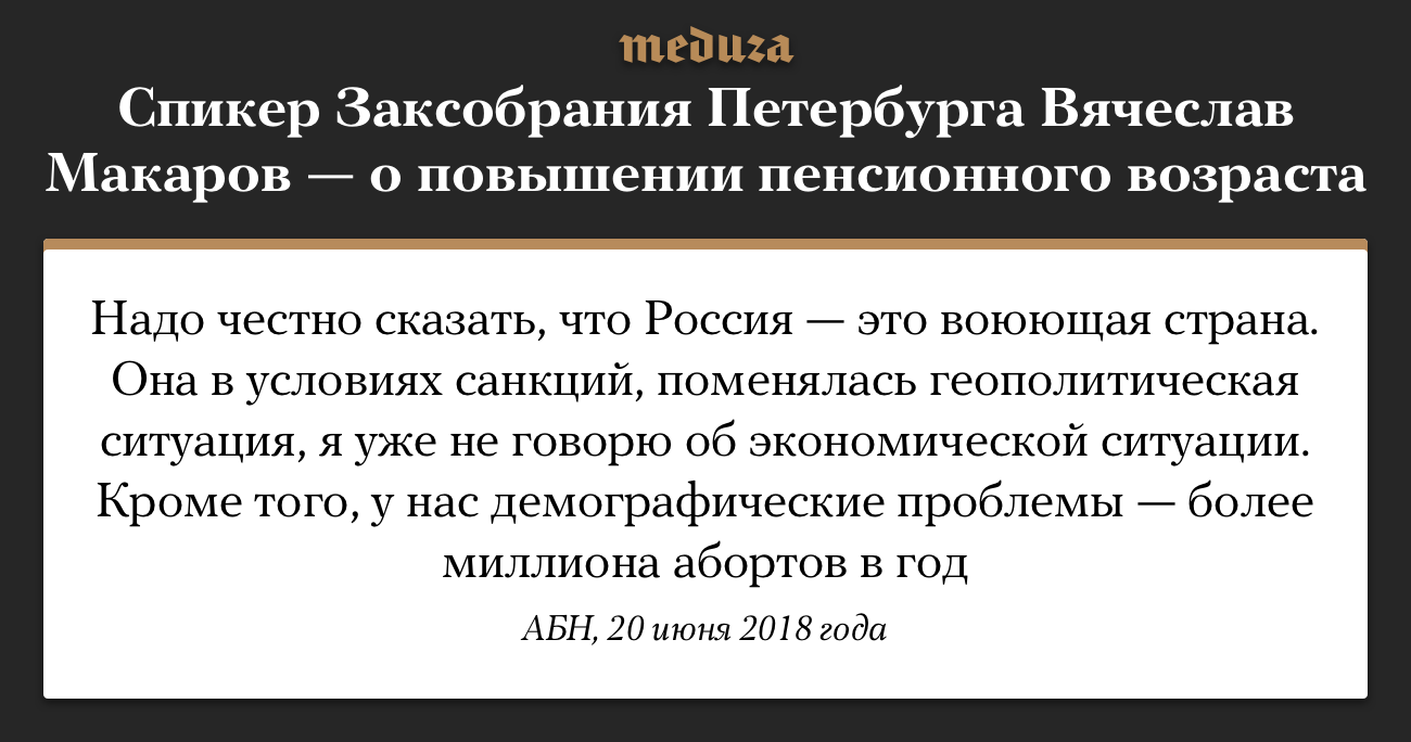 Спикер Законодательного собрания Санкт-Петербурга Вячеслав Макаров на брифинге 20 июня объяснил необходимость повышения пенсионного возраста войной, санкциями и большим количеством абортов. Правительство предлагает повысить возраст выхода на пенсию с 55 до 63 лет для женщин и с 60 до 65 лет для мужчин. Премьер-министр Дмитрий Медведев говорил, что таким образом власти выполняют поставленную президентом задачу по повышению пенсий в стране.