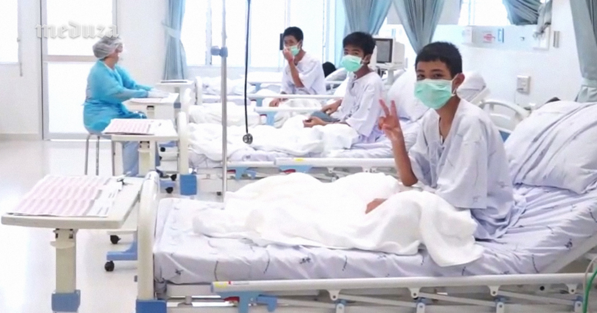 Подростки из футбольной команды «Вепри» в главном госпитале тайской провинции Чианграй. Их привезли туда после эвакуации из полузатопленной пещеры Тхам Луанг Нанг Нон на севере Таиланда. 23 июня 12 игроков «Вепрей» вместе с тренером пошли в пещеру на экскурсию. Они не смогли выбраться наружу, поскольку из-за начавшегося сезона дождей вода затопила вход. Спасатели сумели эвакуировать всех подростков и тренера только через 18 суток. Они ослабли за время пребывания в пещере, но серьезно не пострадали.