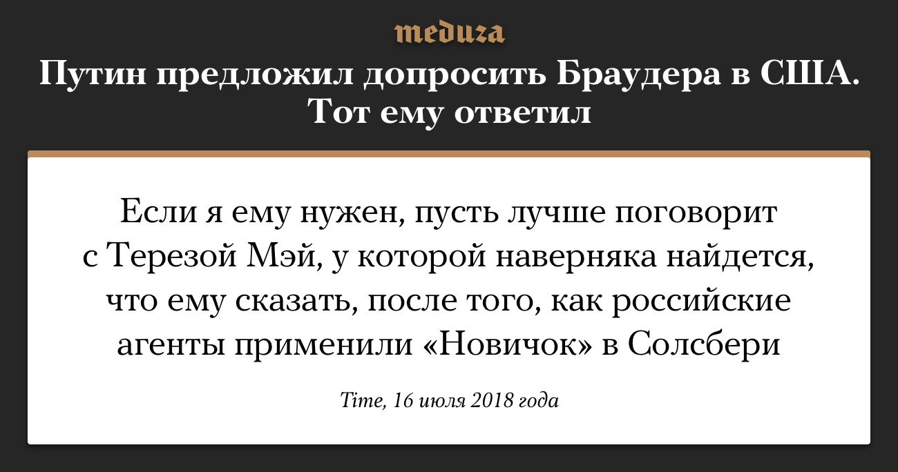 Глава фонда Hermitage Capital Уильям Браудер прокомментировал предложение Владимира Путина провести его допрос в США с участием российских следователей. Допросить Браудера президент РФ предложил на встрече с американским лидером Дональдом Трампом. Браудер в колонке в Time напомнил, что хотя он и родился в Америке, уже почти 30 лет живет в Великобритании и является британским гражданином.
